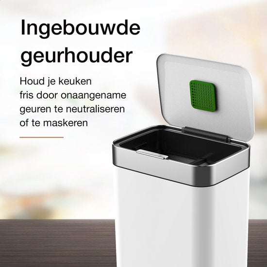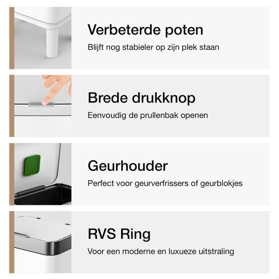 La poubelle offre une capacité généreuse de 60 litres, ce qui la rend parfaite pour tous les ménages. Le bouton tactile vous permet de travailler de manière hygiénique, et les traces de doigts sales sur le couvercle appartiennent au passé. Disponible en noir et en blanc, le design scandinave moderne de la poubelle est un bel ajout à votre cuisine.