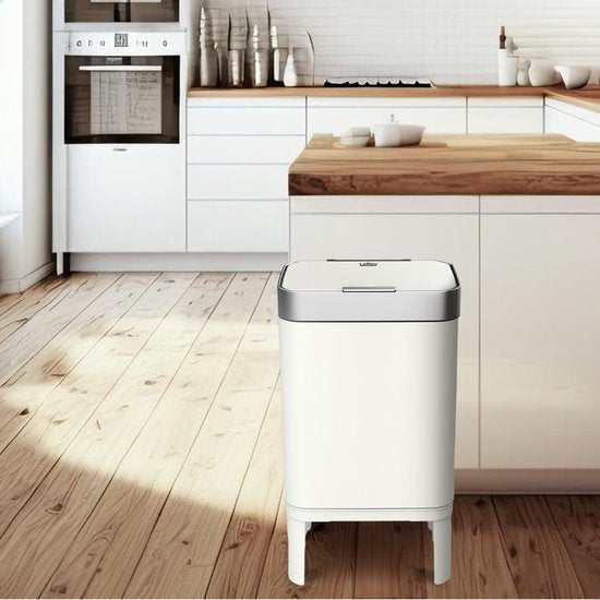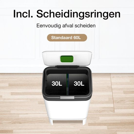 Loftey Trashcan 60 Liter - Push/touch Waste Bin - Duo Waste Bin with Inner Bin - Garbage Can 2 Compartments - Waste Separation 2x30L - Kitchen - White/RVS