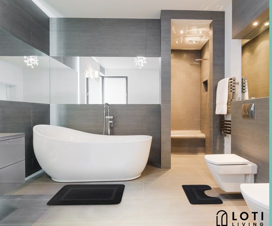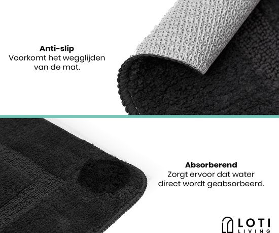 Loti Living Tapis de bain avec tapis de toilette antidérapant - Tapis de douche - Tapis de salle de bain - Tapis de sol - Tapis de bain avec tapis de toilette - Tapis de bain antidérapant - Noir - 50x80 cm + 50x40 cm