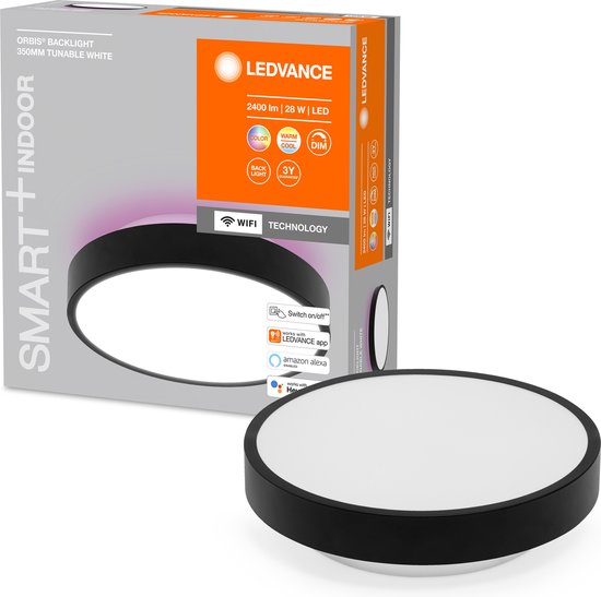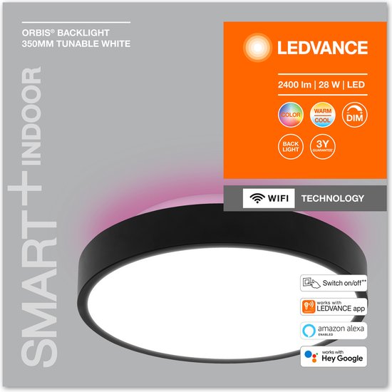 Plafonnier décoratif intelligent avec éclairage principal et d'ambiance en TW RGB, dimmable. Caractéristiques du produit : Contrôlable avec l'application LEDVANCE SMART+ WiFi (compatible avec au moins Android 4.4 ou iOS 9). Commande vocale possible via Google Assistant ou Amazon Alexa. Dimmable. Prend en charge le protocole réseau Wifi. Avantages du produit : Installation facile et rapide. Domaines d'application : Convient à une utilisation en intérieur. Idéal pour les cuisines, les salons, les chambres d'enfants et les bureaux à domicile. Caractéristiques techniques : Support de montage inclus. Vis de montage et chevilles incluses. Le contrôle via l'application ou la voix nécessite un système domestique intelligent compatible. L'utilisation de l'application LEDVANCE SMART+ WiFi nécessite un smartphone ou une tablette.