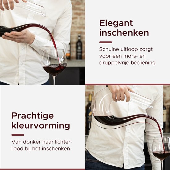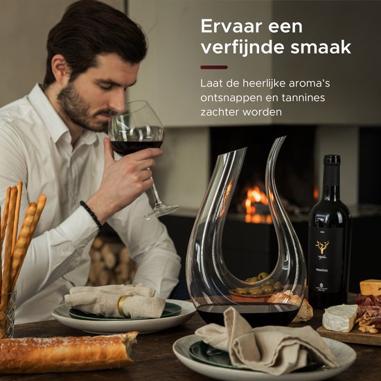 Cette carafe à décanter....r est soufflée à la main dans une forme en U attrayante, ce qui ajoute non seulement à l'esthétique mais améliore aussi considérablement le goût de votre vin ! La décantation est une excellente méthode pour exposer le vin à l'oxygène, tandis que cette technique permet également de séparer les sédiments, souvent présents dans les vins plus anciens, du vin.