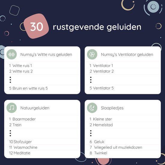 30 sons et mélodies apaisants, allant des bruits blancs et des battements de cœur aux sons de la nature et aux berceuses de Mozart et Brahms.