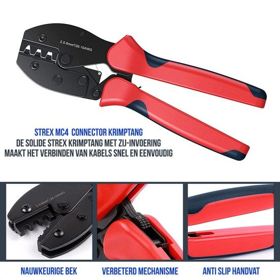 La soudure et le vissage appartiennent au passé : La solide pince à sertir Strex avec entrée latérale permet de connecter les câbles rapidement et facilement. Une pression uniforme de tous les côtés permet un travail propre et précis avec la pince. Avec une plage de sertissage de 2,5, 4 et 6 mm², elle rétrécit presque tout. Cette pince à sertir est idéale pour sertirles connecteurs MC4 sur les câbles solaires pour les panneaux solaires.
