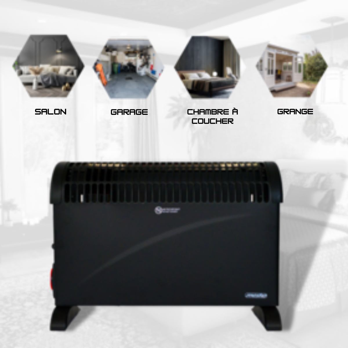 - Equipé de 3 réglages, 750W, 1250W, 2000W, équipé d'un thermostat.