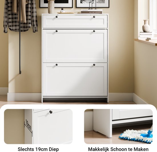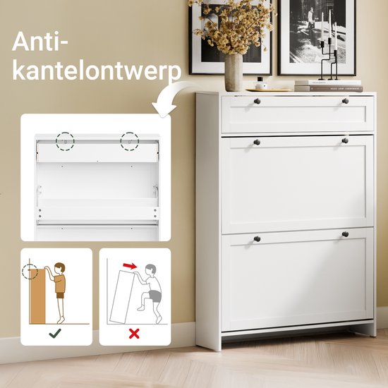 L'armoire à chaussures SoBuyest d'une profondeur de seulement 19 cm spécialement conçu pour les espaces restreints où chaque centimètre compte.ressource d'ordre fiable ; les deux portes basculantes permettent de ranger plusieurs paires de chaussures sans que l'armoire ne fasse saillie dans le couloir. La surface blanche nette est élégamment contrastée par les poignées noires, créant un look contemporain et frais qui s'intègre parfaitement dans tout intérieur moderne. Le tiroir supplémentaire situé dans la partie supérieure permet également de ranger les clés, le courrier ou d'autres petits objets essentiels. En plus de son attrait esthétique, ce meuble constitue une source pratique de stabilité et de sécurité dans la maison. Fabriquée en MDF E1 de haute qualité, l'armoire résiste à un usage quotidien et se nettoie facilement à l'aide d'un chiffon humide. Pour garantir la sécurité, en particulier dans les foyers avec des enfants ou des animaux domestiques, l'armoire est équipée d'un système anti-basculement essentiel pour le montage mural. Les pieds en silicone situés à la base protègent votre sol des rayures et garantissent que l'armoire reste fermement en place. Profil ultra-mince: La ressource idéale pour le stockage dans les allées très étroites grâce à sa profondeur minimale de 19 cm.Sécurité et qualité durable