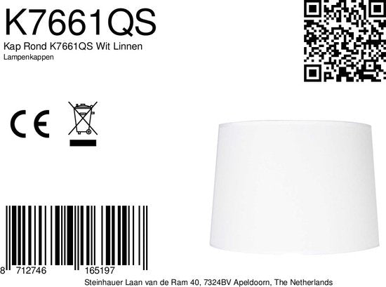 Les abat-jour portant le numéro d'article K7661QS sont fabriqués par Mexlite. Le numéro EAN de cet article est 8712746165197. Cet abat-jour blanc est fabriqué en lin et a un poids de 1 kg.