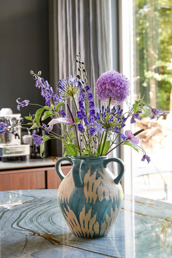 Le vase Caldo de Mica Decorations est un véritable accroche-regard pour votre intérieur ! Ce vase est de couleur bleu foncé et est décoré d'un motif beige. Les différentes oreilles lui confèrent une allure particulière. Mesurant L24,5 x L24 x H30 cm, c'est le vase idéal pour les plumes, les branches et les fleurs artificielles. Comme il est fabriqué en céramique, il a un aspect authentique, mais il ne faut pas oublier que ce matériau est poreux et n'est donc pas complètement étanche. Vous avez déjà choisi votre emplacement ?
