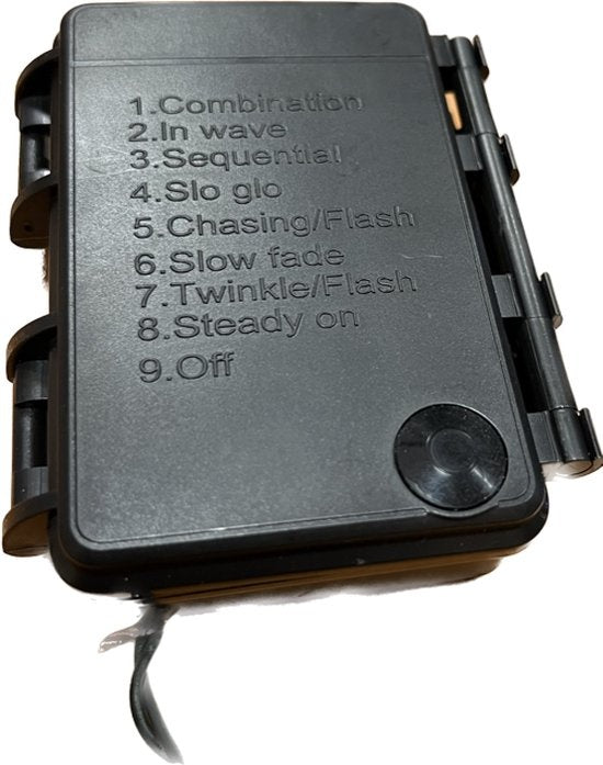 - 8 fonctions d'éclairage : 1. combinaison, 2. en vague, 3. séquentiel, 4. lent, 5. poursuite/flash, 6. fondu lent, 7. scintillant/flash, 8. allumé en continu, 9. éteint