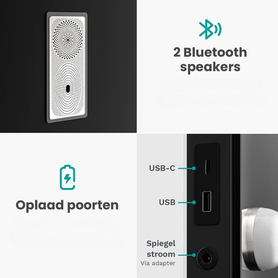 Profitez de votre musique préférée, de podcasts ou de sons apaisants grâce aux hauts-parleurs Bluetooth intégrés, pendant que vous exécutez votre routine de beauté. Parallèlement, rechargez facilement votre smartphone ou vos accessoires grâce aux ports USB et USB-C intégrés - le summum de la commodité dans un design élégant.