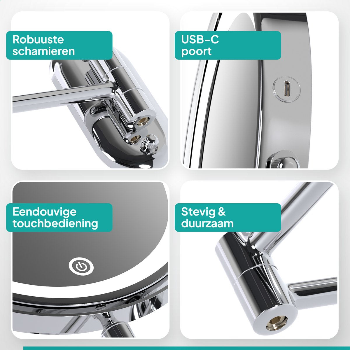 Le miroir de maquillage Mirlux est conçu pour ceux qui ne veulent pas faire de compromis sur la qualité, le confort et le style. Avec un grossissement 10x, un éclairage LED à intensité variable et un bras flexible, ce miroir offre tout ce dont vous avez besoin pour une toilette parfaite dans les moindres détails. Ajoutez à cela le design chromé durable et la facilité d'utilisation sans fil, et vous obtenez un complément indispensable à l'intérieur de votre salle de bain.