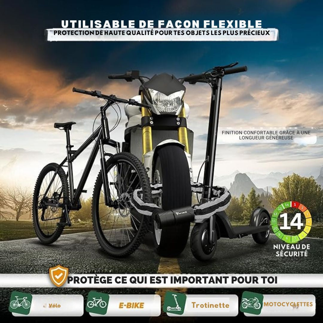 Assurez une protection maximale à votre véhicule avec l’antivol à chaîne MIVELO, conçu pour offrir une barrière infranchissable contre le vol. Doté d'une chaîne carrée en acier trempé de 10 mm d'épaisseur, cet antivol atteint un niveau de sécurité exceptionnel (niveau 14), garantissant une résistance extrême face aux tentatives d'effraction à la scie ou au coupe-boulon.