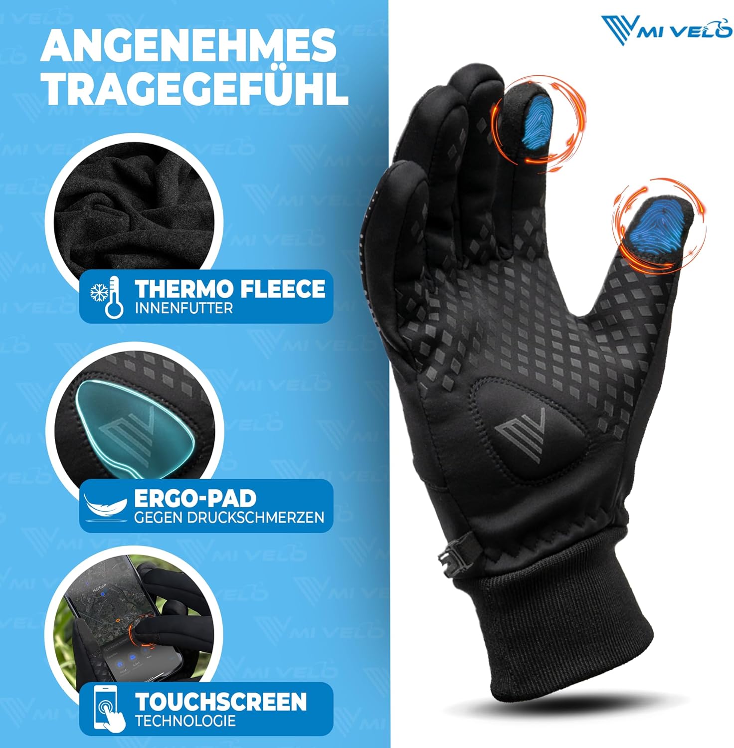 MIVELO Gants de cyclisme VELORIDER - Coupe-vent et imperméable - Fonctionne avec les écrans tactiles - Noir - Taille XL