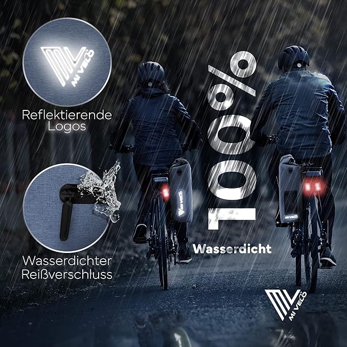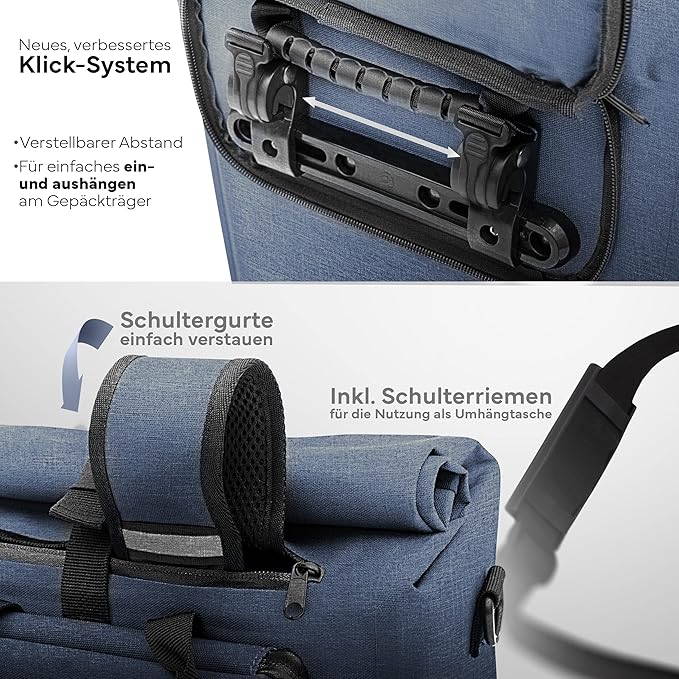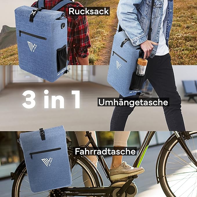 MIVELO - Sacoche pour porte-bagages - 3 en 1 - Capacité de 25 litres - Bleu Jeans & Polyester imperméable - Détails réfléchissants - Pour un usage quotidien