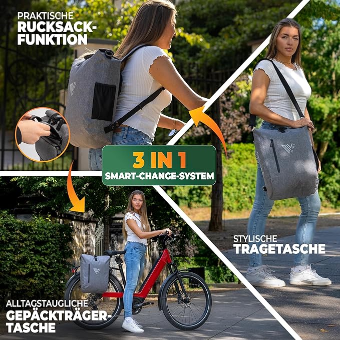 Grâce à sa conception innovante, vous pouvez utiliser ce sac exactement comme vous le souhaitez : comme sac à vélo pour le porte-bagages, comme sac à dos lors de vos promenades ou comme sac à bandoulière lors de vos déplacements. Idéal pour les trajets domicile-travail, les sorties ou les déplacements quotidiens en ville.