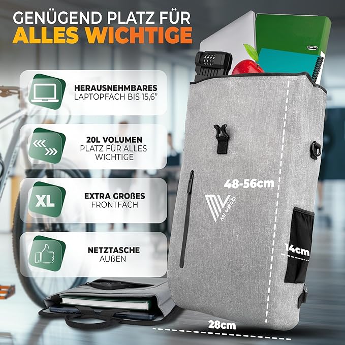 MIVELO 3-in-1 Pannier - Sac à dos et sac à bandoulière - Imperméable avec compartiment pour ordinateur portable et serrure - 20L - Gris
