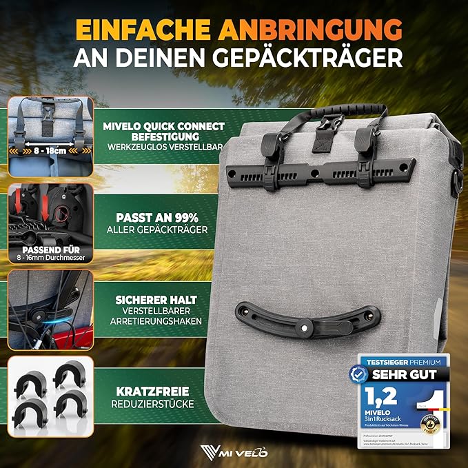 Avec cette sacoche de vélo 3-en-1 intelligente de MiVelo, vous n'aurez plus jamais à choisir entre confort et fonctionnalité. En 15 secondes, vous transformez le sac en un sac à dos robuste en un sac à vélo pratique pour le transporteur &ndash ; et vice-versa. Idéal pour les navetteurs, les étudiants et les cyclistes amateurs qui recherchent un maximum de flexibilité lors de leurs déplacements.
