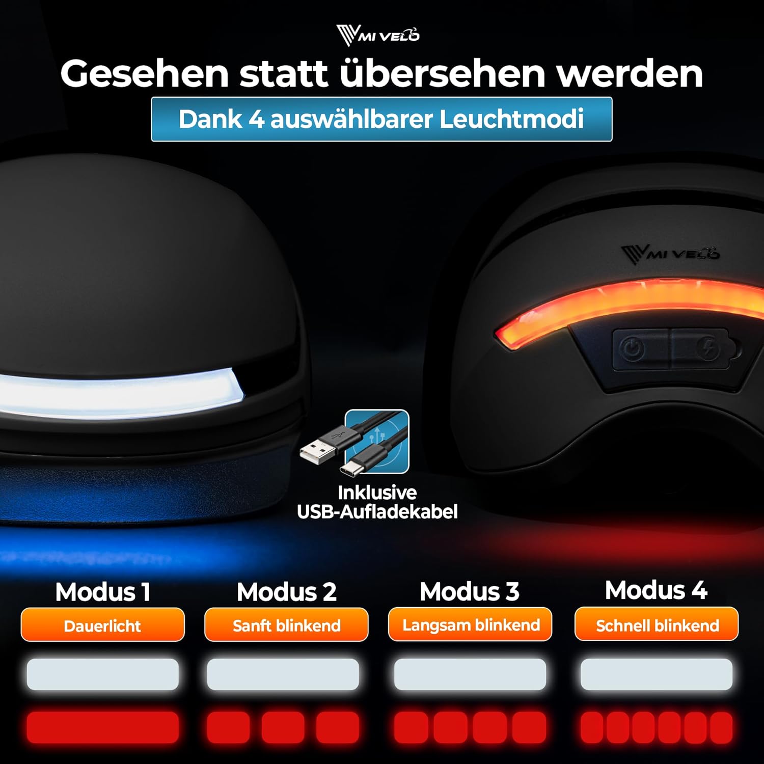 - Système d'éclairage intégré pour une visibilité à 360° - L'éclairage LED intégré à l'avant et à l'arrière avec 4 modes d'éclairage (y compris l'éclairage continu et l'éclairage clignotant) permet d'améliorer la visibilité jusqu'à 200 %. Vous serez ainsi remarqué à temps - de jour, au crépuscule et de nuit. La lumière est facilement rechargeable via USB-C.
