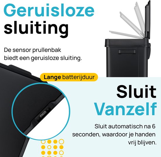 L'une des fonctionnalités pratiques de la poubelle rectangulaire de la marque MOA est le capteur intégré. Ce capteur permet d'ouvrir la poubelle sans la toucher. C'est idéal si, par exemple, vous avez les mains sales après avoir cuisiné et que vous ne voulez pas salir la poubelle. Ou si vous venez de vous laver les mains et que vous voulez jeter quelque chose. Vous préférez l'ouvrir de manière traditionnelle en appuyant sur le couvercle ? C'est également possible.