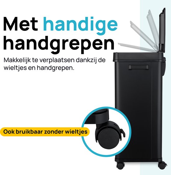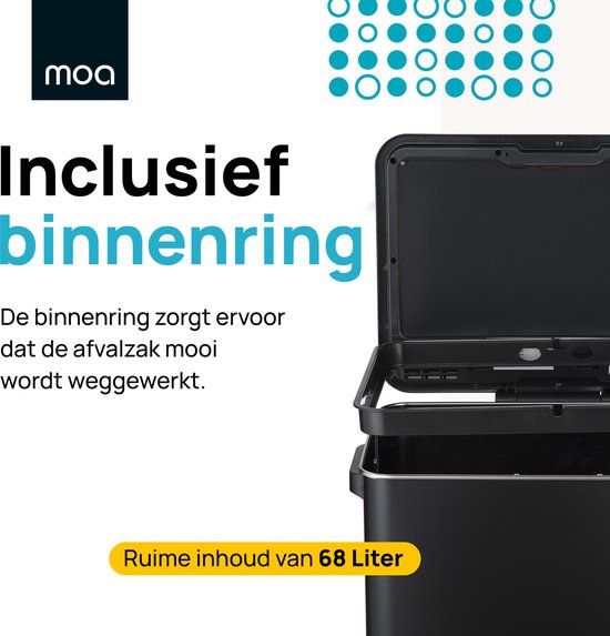 En plus du capteur pratique qui détecte si le couvercle peut être fermé, la poubelle MOA dispose également d'un couvercle silencieux. Celui-ci garantit que le couvercle se ferme toujours en douceur. La poubelle pèse au total 5 kilogrammes, ce qui la rend facile à déplacer. Elle a une capacité de 68 litres et des dimensions de 33 cm x 45 cm x 72 cm. Les pieds en caoutchouc antidérapants assurent la stabilité nécessaire.