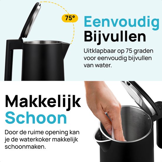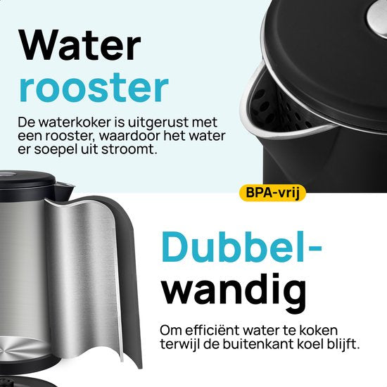 La double paroi offre non seulement un excellent chauffage et une bonne isolation, mais elle maintient également l'extérieur au frais. Ceci est particulièrement utile pour une utilisation en toute sécurité, notamment en présence de jeunes enfants, et au cas où vous toucheriez accidentellement la bouilloire. La paroi intérieure en acier inoxydable contribue à une plus longue durée de vie et garantit que l'eau est exempte de BPA et facile à nettoyer.