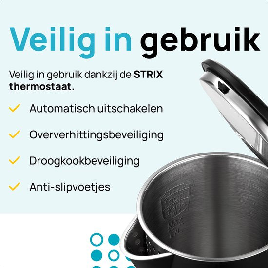Cette bouilloire est équipée d'un thermostat Strix, le leader des thermostats pour bouilloires, qui assure un haut niveau de sécurité. Il s'éteint automatiquement, dispose d'une protection contre l'ébullition à sec et offre une protection contre la surchauffe.La protection Ings vous offre la tranquillité d'esprit de pouvoir toujours faire bouillir de l'eau en toute sécurité.