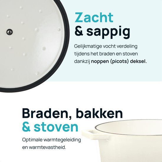 La fonte est réputée pour ses excellentes propriétés d'isolation thermique, et cette cocotte en tire pleinement parti. Le matériau se réchauffe lentement mais conserve la chaleur très longtemps, en la répartissant uniformément dans toute la casserole. Vos plats sont ainsi cuits uniformément, sans points chauds, ce qui est idéal pour les ragoûts qui nécessitent une cuisson lente et homogène. La bonne rétention de la chaleur permet également d'économiser de l'énergie, car vous pouvez cuisiner à une température plus basse après le préchauffage.