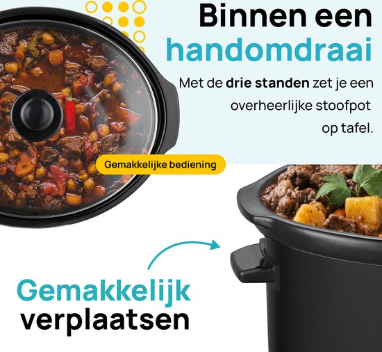 La mijoteuse contient une casserole intérieure en céramique avec un revêtement antiadhésif, un couvercle en verre de sécurité robuste et transparent et la mijoteuse elle-même. La casserole intérieure et le couvercle peuvent être lavés au lave-vaisselle pour un nettoyage facile après utilisation.