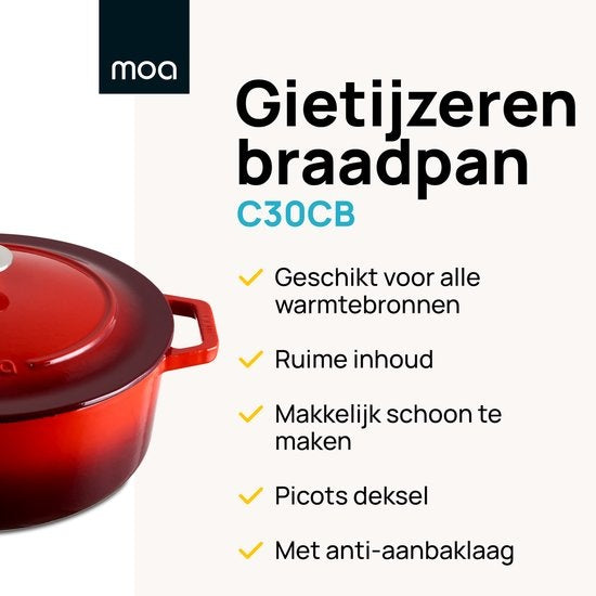 MOA Casserole en fonte - Capacité 7,2 litres - 30CM - Ronde - Toutes sources de chaleur - Egalement pour induction - Poids 7,3 kg - Rouge cerise - C30CB