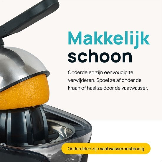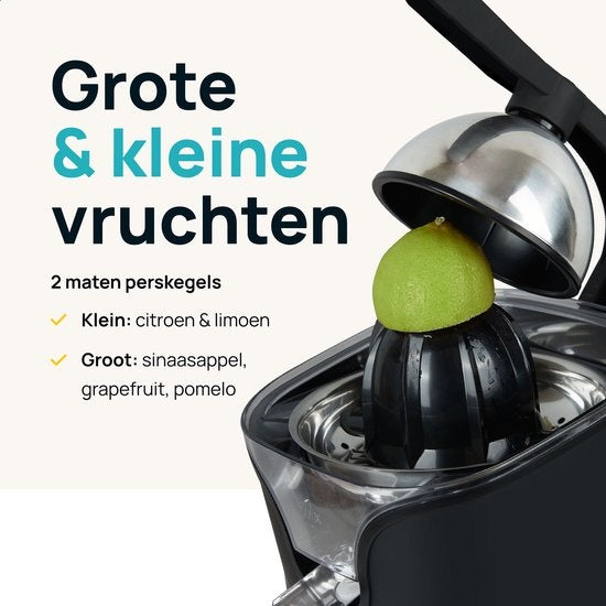 Facile à utiliser - Branchez la fiche dans la prise, placez le fruit sur le cône et poussez le levier vers le bas. Récupérez le jus dans le collecteur fourni ou laissez-le couler directement dans votre verre grâce au goulot. Pas de prise de courant à proximité ? Le pressoir peut également être utilisé manuellement.