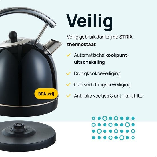 Le produit a une longue durée de vie. D'abord parce qu'il est fabriqué en acier inoxydable noir, ce qui signifie que la rouille n'a aucune chance. Deuxièmement, la bouilloire dispose d'un élément chauffant caché, ce qui constitue une protection supplémentaire contre le calcaire, entre autres. Troisièmement, l'embouchure de la bouilloire est équipée d'un filtre anti-calcaire. Ce filtre est amovible et élimine les petites particules de calcaire.