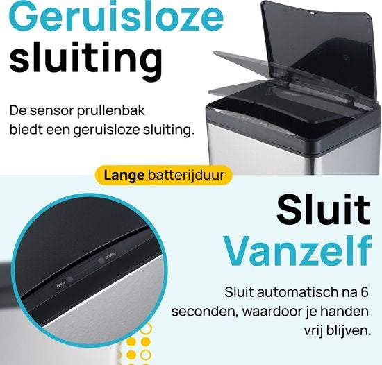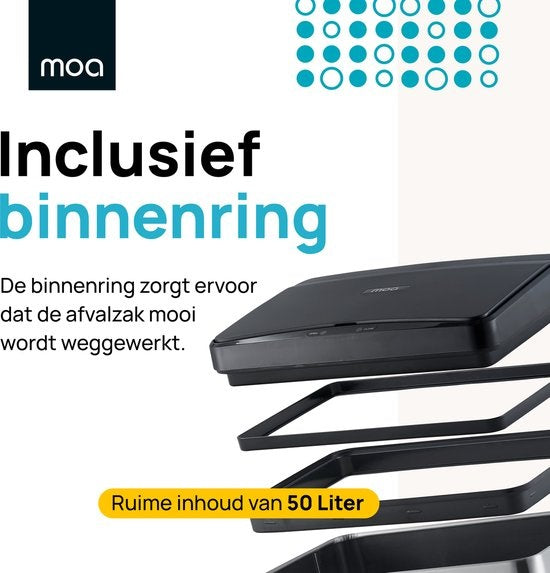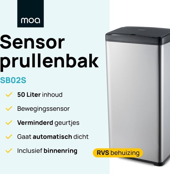 MOA Sensor Waste Bin - 50 litres - acier inoxydable & ABS durable - Antidérapant - Couvercle silencieux - Mode de fermeture différée - Inox - SB02S