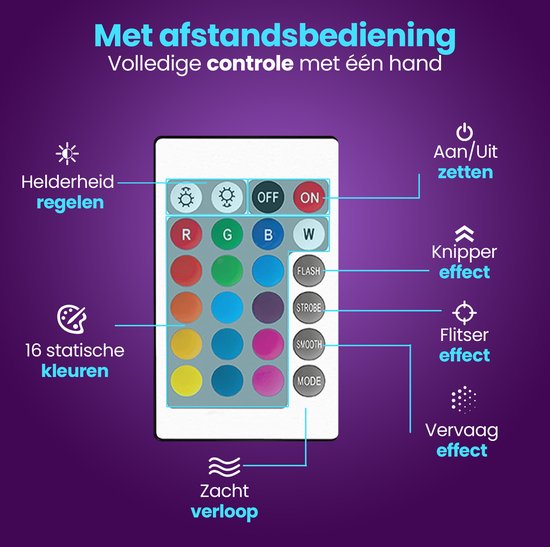 16 couleurs: Choisissez parmi 16 couleurs différentes, des tons chauds aux tons froids, et personnalisez l'ambiance à votre guise.