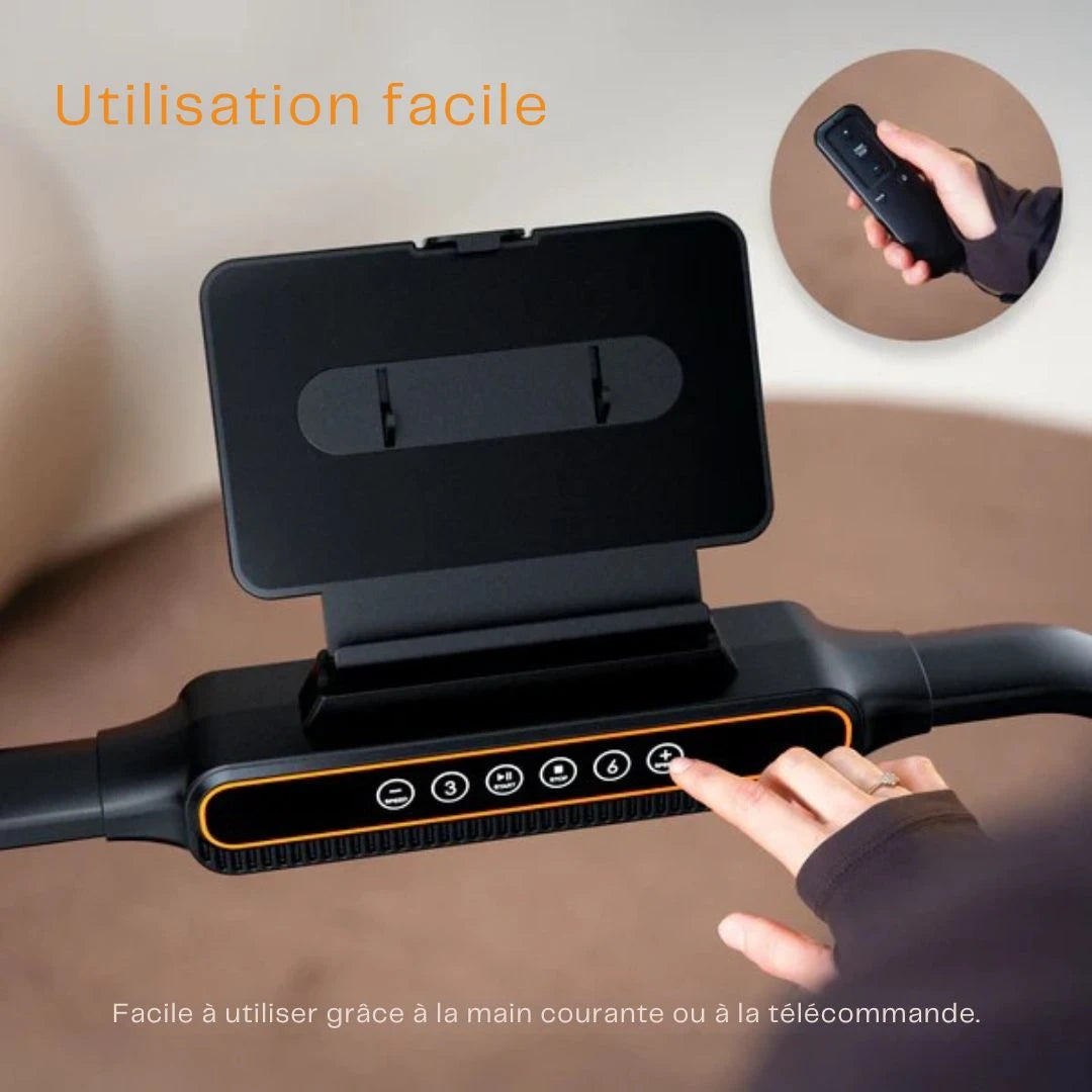 L'écran affiche la vitesse, la distance, le temps, les calories et les pas. Le contrôle se fait via les boutons sur la rampe ou avec la télécommande. Vous pouvez également diffuser de la musique via Bluetooth pendant votre séance