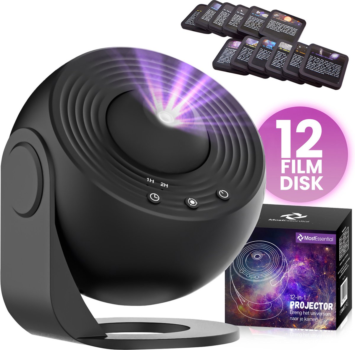 Lampe de projecteur 12 en 1 - MostEssential Premium - Projecteur d'Étoiles, Galaxie, Ciel Étoilé, Espace et Univers - 12 W - Noir