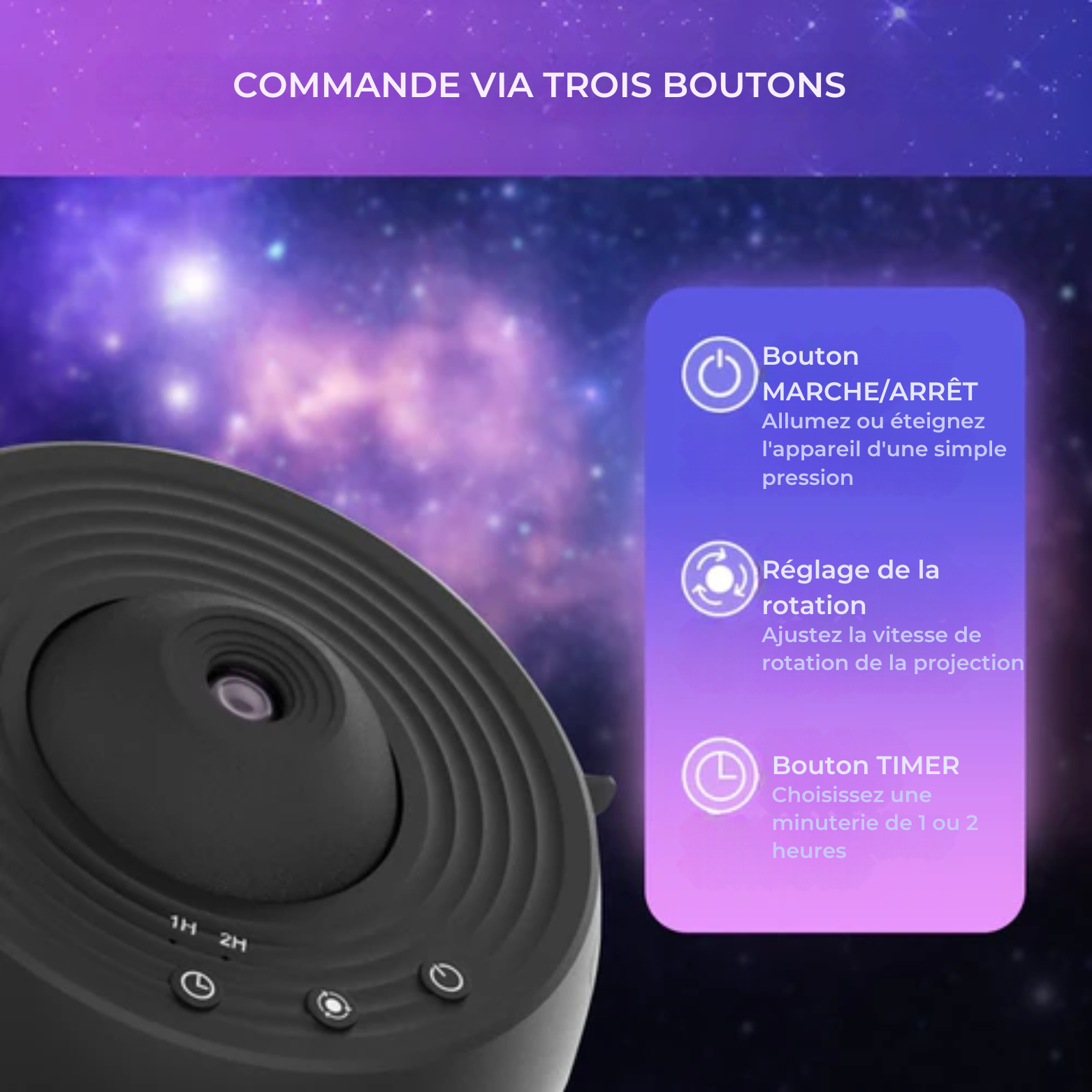 Minuterie intégrée : Réglez facilement une minuterie de 1 ou 2 heures. Le projecteur s’éteint automatiquement après 4 heures sans minuterie.