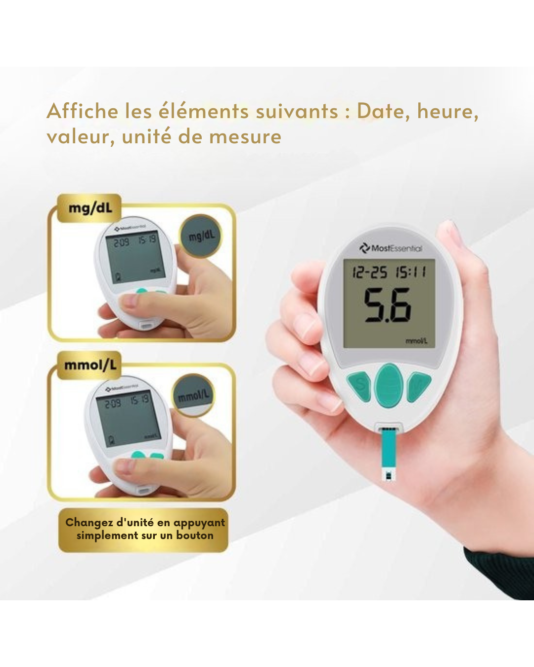 Unités de mesure ajustables (mmol/L ou mg/dL)