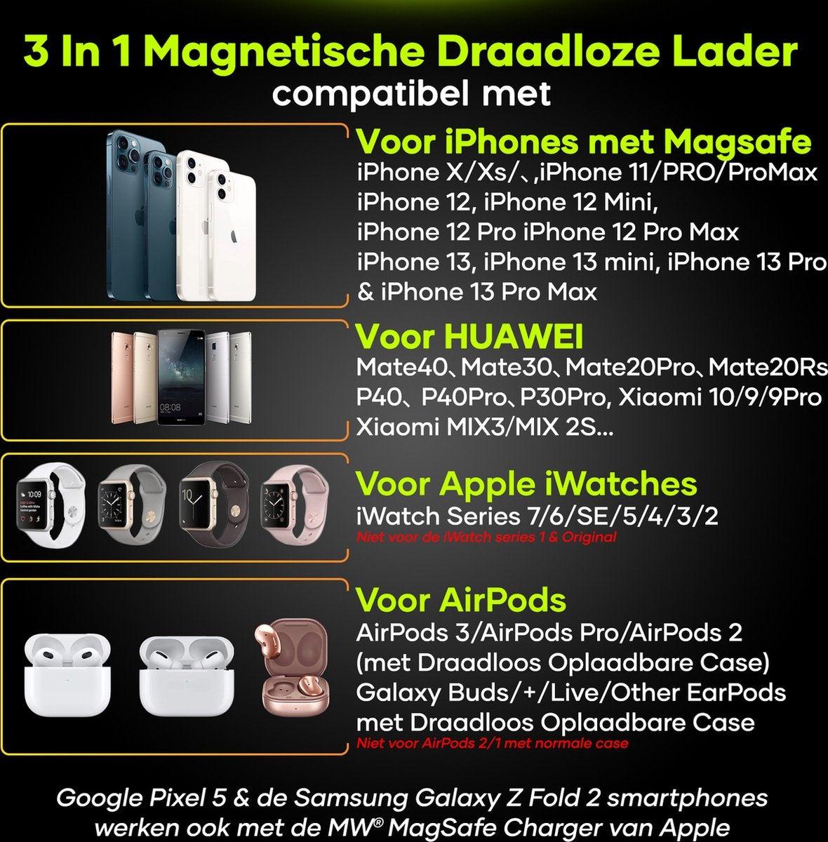 Avec ce chargeur sans fil 3-en-1 pour votre montre Apple, vos Airpods et votre stylo Apple. Chargez tout en même temps avec 1 système universel. Tous les iPhones à partir de l'iPhone 8 se chargent sans fil (il n'est pas recommandé d'utiliser les iPhones à partir du modèle 12 avec ce chargeur). Les chargeurs sans fil Qi- de Samsung sont également disponibles. Vos AirPods sont faciles à poser et se rechargent automatiquement. Placez votre Apple Watch sur le support pour la charger, vous aurez besoin de votre propre câble de charge pour cela.