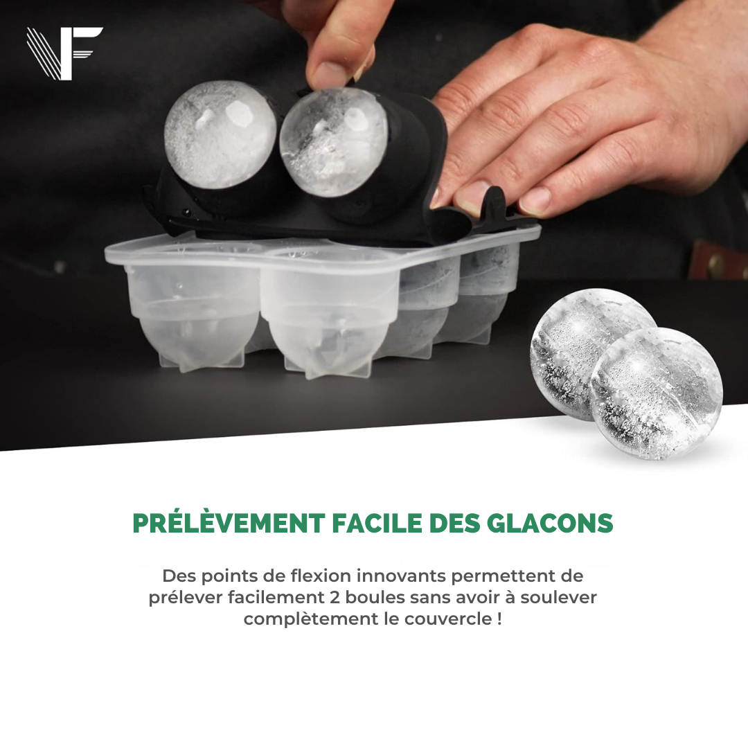 Boules de glace XXL (env. Ø 5 cm) : leur forme ronde fond plus lentement et refroidit plus efficacement, parfait pour préserver les arômes des boissons de qualité.