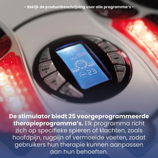 Pensé pour un usage complet et polyvalent, il propose 25 programmes thérapeutiques prédéfinis, des coussinets de gel pour zones ciblées, une télécommande pratique et une minuterie réglable. Que ce soit pour les pieds, les jambes, le dos ou les bras, ce stimulateur s’adapte à vos besoins et vous accompagne dans votre bien-être quotidien.