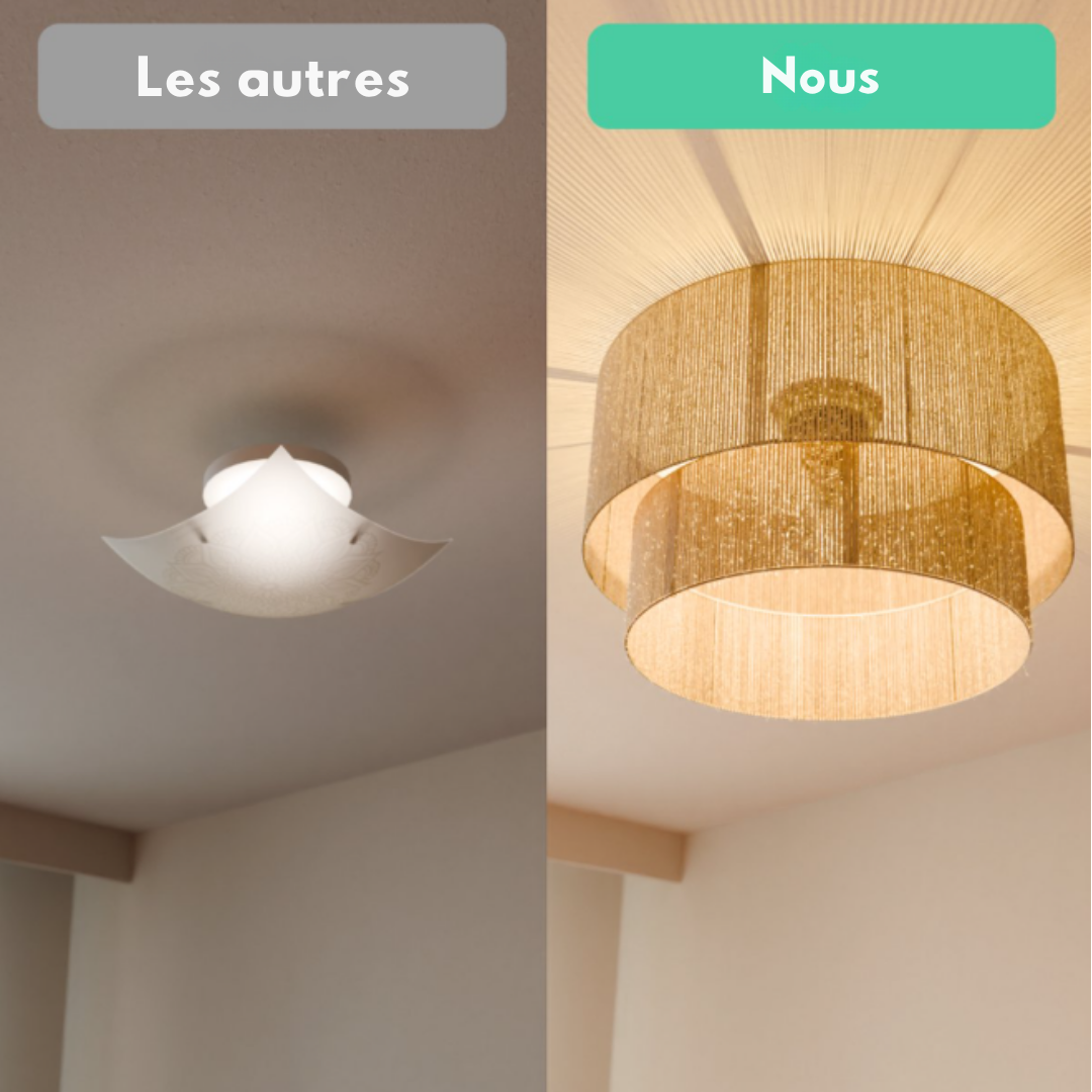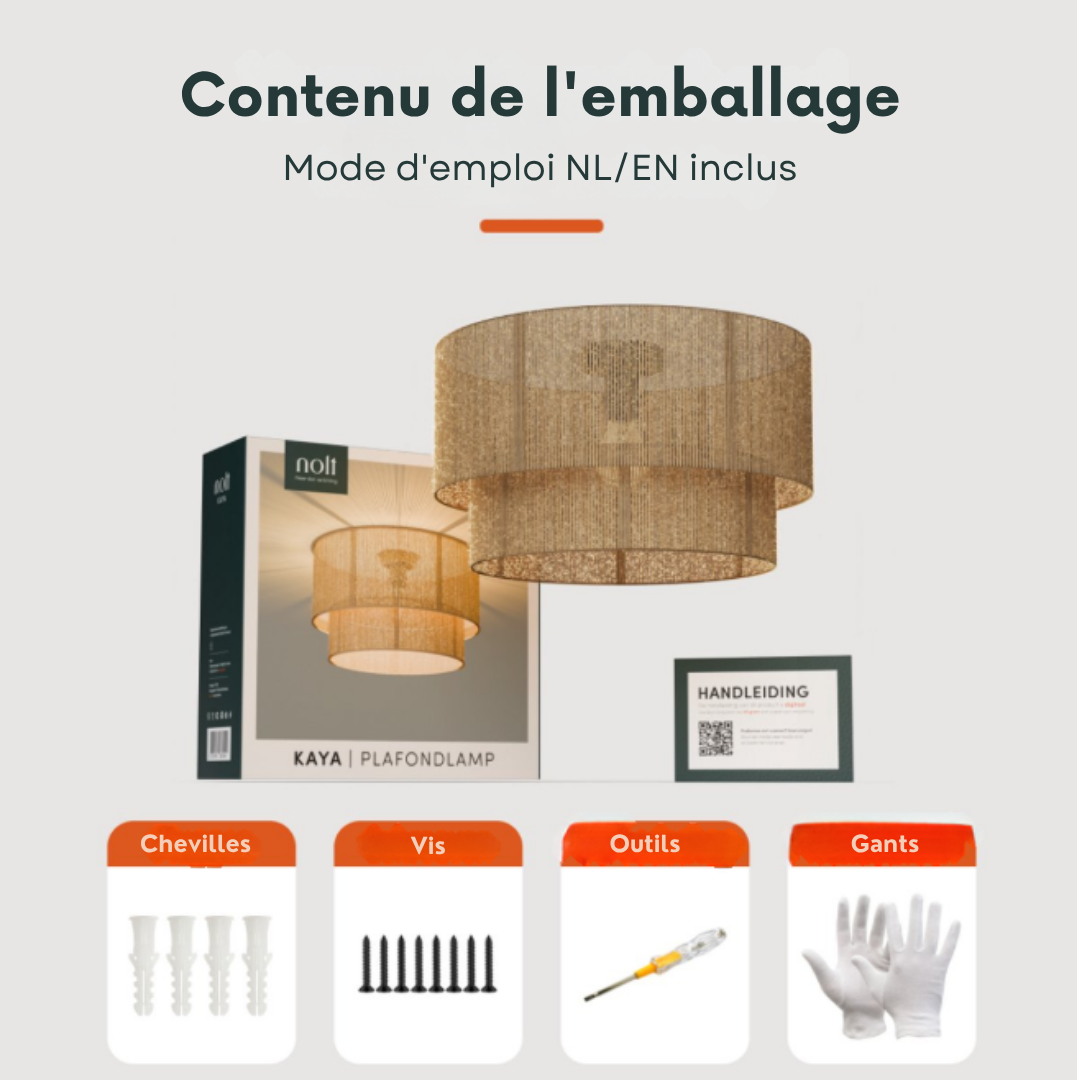 Livré avec un kit de montage complet et des instructions claires, le Kaya se fixe facilement au plafond. Il est compatible avec toutes les ampoules E27 (non incluses), et peut être associé à une ampoule LED dimmable pour ajuster l’intensité lumineuse selon vos envies.