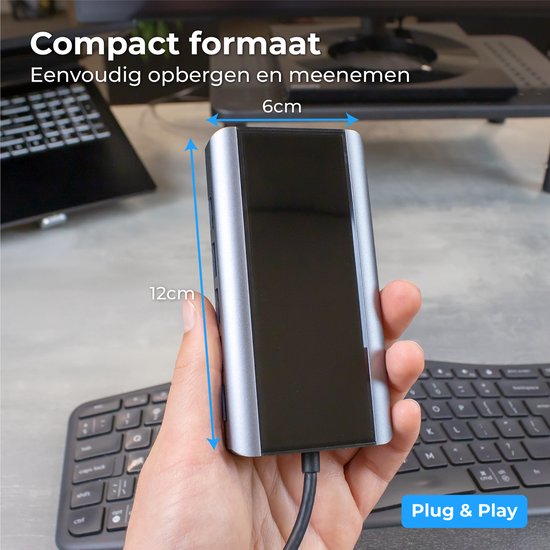 La station d'accueil pour ordinateur portable 13-en-1 de Nuvance est une solution parfaite pour...Cette station d'accueil est conçue pour être universellement compatible, ce qui lui permet de fonctionner superbement avec n'importe quel ordinateur portable équipé d'un port USB-C en tant que répartiteur USB pratique. Que vous utilisiez un MacBook, Dell, HP ou toute autre marque, cet appareil garantit une intégration fluide et une connectivité sans souci, vous permettant de rester productif à tout moment et en tout lieu.