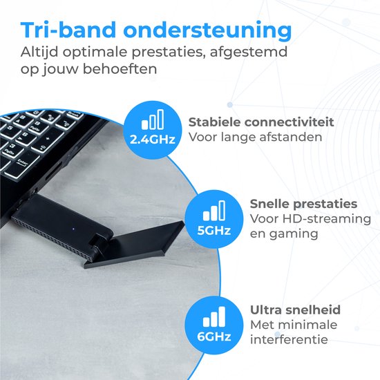 Profitez d'une flexibilité et d'une vitesse inégalées avec la prise en charge de 2,4GHz, 5GHz et 6GHz. Que vous recherchiez une connectivité fiable sur de plus longues distances (2,4 GHz), des performances rapides pour le streaming HD et les jeux (5 GHz) ou des vitesses extrêmement rapides et une faible latence avec peu d'interférences (6 GHz), cet adaptateur offre toujours les meilleures performances, adaptées à vos besoins.