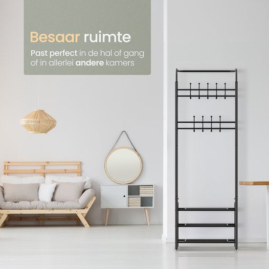 MATÉRIAU : Ce portemanteau est fabriqué en métal avec un revêtement en poudre noir mat. Le portemanteau contient dix-huit crochets pour les manteaux et les écharpes, entre autres, et trois étagères pour les chaussures et les chapeaux. Ce porte-manteau offre de la place pour au moins 6 paires de chaussures et 18 manteaux, y compris ceux des enfants. Vous rentrez donc toujours dans une maison bien rangée !