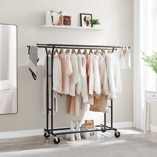 ADJUSTABLE : L'étagère à vêtements est extensible des deux côtés (129-169 cm), ce qui laisse beaucoup d'espace et il y a une butée, de sorte que les cintres ne peuvent pas glisser hors du support. La hauteur peut être réglée de 148 à 172 cm. Les montants latéraux sont également réglables en hauteur. STABILITÉ ET CAPACITÉ DE PORTAGE DE 110 KG : L'angle des barres supérieures a été redessiné, ce qui assure une bonne stabilité, l'étagère à vêtements ne peut pratiquement pas basculer. Le renfort latéral est utilisé par des crochets spéciaux sur le poteau, même sous charge, il est très solide. A l'extrémité du tube des barres supérieures inclinées, le diamètre est en 3 dimensions, grâce à cet usinage spécial de l'extrémité du tube, les barres sont particulièrement solidement reliées. 4 ROUES INDUSTRIELLES : Contrairement aux rouleaux en nylon, ces roues robustes sont plus grandes et plus faciles à manœuvrer, même à pleine charge (110 kg), vous pouvez encore bien manœuvrer l'étendoir à vêtements. 2 roues avec freins, si nécessaire, elles peuvent être bloquées. Convient également à la vente au détail de textile, répond aux exigences commerciales. FACILE À MONTER : Grâce au nombre clair de pièces individuelles et aux instructions faciles à comprendre, cet étendoir à vêtements est facile à monter. En quelques étapes et clics, vous disposez d'un étendoir à vêtements stable en métal chromé SPÉCIFICATIONS : Dimensions : 129 x (148-172) x 55 cm (L x H x P) Hauteur des rouleaux : 12 cm Matériau : tubes en fer chromé Couleur : noir Dimensions de l'emballage : 90 x 59 x 11,9 cm (L x H x P) Poids net : 8,9 kg CONTENU DU PAQUET : 1 x étendoir à vêtements en pièces détachées 1 x manuel (NL, EN, FR, ES, IT, DE) Nous vous offrons un service clientèle de qualité professionnelle avant et après votre achat. Vous disposez toujours d'un délai de réflexion de 30 jours.