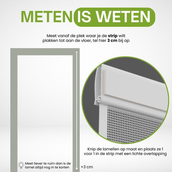 Démarrez en mesurant la porte ! - Mesurez à partir du point où vous souhaitez appliquer la bande en haut du cadre de la porte jusqu'au sol. Ajoutez-y 3 cm supplémentaires ; cela ira dans la bande lors de la fixation. Veillez à ce que les lamelles ne touchent pas le sol, car cela pourrait nuire à leur fonctionnalité. Coupez ensuite les lamelles à la bonne taille.