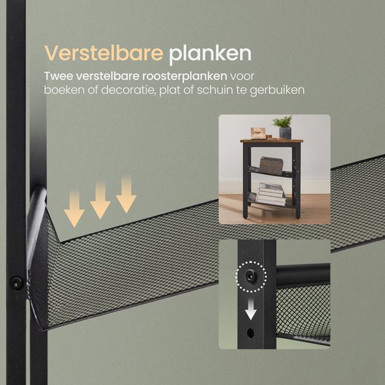 Le cadre en acier solide assure la stabilité et la capacité de charge. Le plateau en bois supporte jusqu'à 20 kg, tandis que les étagères grillagées peuvent supporter jusqu'à 5 kg chacune. Vous pouvez donc placer des objets encore plus lourds sans aucun souci. Le poids total de la table est de 3,8 kg, ce qui la rend facile à déplacer tout en restant robuste.