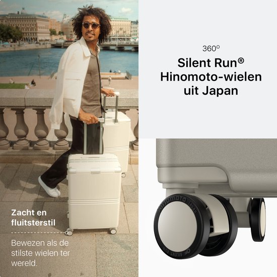 Cette valise est équipée de roues japonaises Hinomoto Silent Wheels de qualité supérieure, connues dans le monde entier pour être les roues les plus silencieuses. Chaque élément a été soigneusement conçu : le trolley peut être réglé sur 3 à 4 positions pour un confort maximal. Des sangles de compression pratiques vous permettent d'emballer plus de bagages efficacement, tandis que le compartiment AirTag caché offre la tranquillité d'esprit que votre valise est toujours facile à suivre.