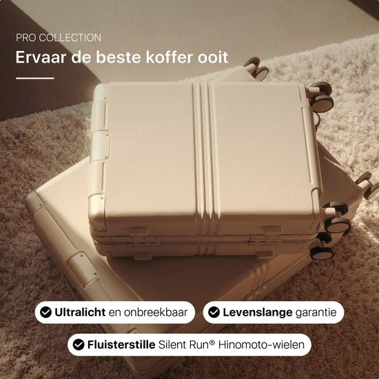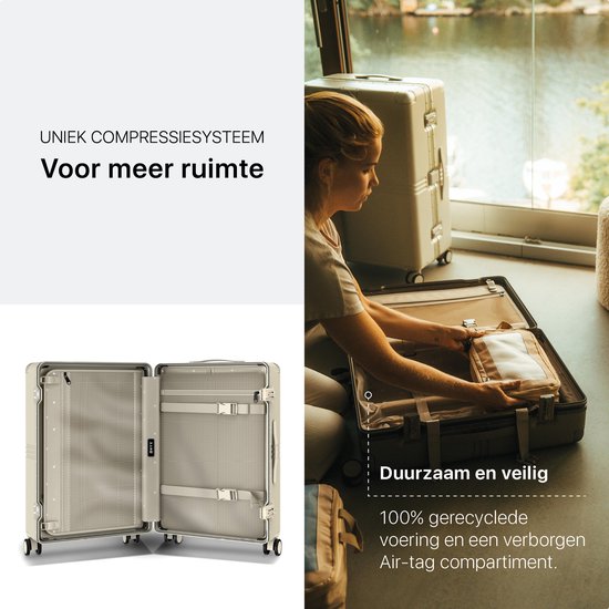 Profitez des roues japonaises Hinomoto fluides, d'un corps en polycarbonate Makrolon allemand super solide (30 % recyclé), d'un noyau et de pare-chocs en aluminium améliorés, des serrures Yif TSA les plus sûres et d'un système de compression innovant avec une doublure 100 % recyclée. Élégant, durable et doté de fonctionnalités uniques. Un design invincible, et donc assorti d'une garantie à vie.