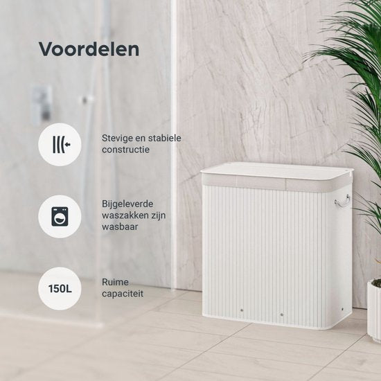 Organess panier à linge 3 compartiments - Trieur de linge - Panier à linge avec couvercle - Pliable - 150L - Bambou blanc