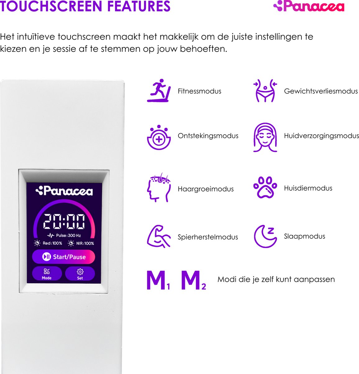 Apportez la thérapie de lumière rouge professionnelle à votre domicile avec le panneau Panacea ATP Pro 1500. Ce système avancé pour tout le corps est conçu pour soutenir votre santé au niveau cellulaire, du rajeunissement de la peau à la récupération des muscles profonds. La puissance de 8 longueurs d'onde scientifiques Le panneau ATP Pro 1500 se distingue par l'utilisation de pas moins de huit longueurs d'onde soigneusement sélectionnées (590 nm, 630 nm, 660 nm, 810 nm, 850 nm, 940 nm, 1060 nm et 1072 nm). Alors que les panneaux standard sont souvent limités à deux longueurs d'onde, cette série Pro offre un spectre plus large pour un impact thérapeutique maximal. La combinaison de la lumière rouge (RED), du proche infrarouge (NIR) et de l'infrarouge (IR) stimule les mitochondriën &ndash ; les centrales électriques de vos cellules &ndash ; pour une production accrue d'ATP, ce qui se traduit par plus d'énergie, une peau éclatante et une récupération plus rapide après l'effort physique. Les panneaux de la série Pro offrent un spectre plus large pour un impact thérapeutique maximal. La peau est plus éclatante et la récupération après un effort physique est plus rapide. Grâce à l'écran tactile intégré de l'ATP Pro, vous avez un contrôle total sur votre traitement. Vous pouvez régler indépendamment l'intensité des lumières rouge et infrarouge (de 0 % à 100 %) ou choisir l'un des programmes prédéfinis pour l'amélioration de la peau, la récupération musculaire ou l'optimisation du sommeil, entre autres. Le panneau est également équipé d'une fonction de pulsation et d'une minuterie réglable. Avec une puissance de 1500 watts et une irradiance (rayonnement) très élevée de plus de 220 mW/cm² ; à une distance de 15 cm, vous avez la garantie d'une séance puissante qui pénètre profondément dans les tissus, tandis que les émissions de CEM sont négligeables. Pour la première fois, l'appareil est équipé d'une fonction de pulsation et d'une minuterie réglable. 8 longueurs d'onde: Comprend des longueurs d'onde uniques telles que 1060 nm pour une récupération en profondeur et la combustion des graisses. Puissance professionnelle: 300 LED puissantes de 5 watts à double puce pour un traitement de tout le corps. La puissance de l'appareil est de 5 watts pour un traitement de tout le corps. La puissance de l'appareil est de 5 watts pour un traitement de tout le corps. Écran tactile avancé:Utilisation facile avec fonction de gradation et programmes variés. Skin & ; Repair: Stimule le collagène, réduit les rides et accélère la récupération des muscles et des articulations. La peau et la réparation:La puissance de 8 longueurs d'onde scientifiques
